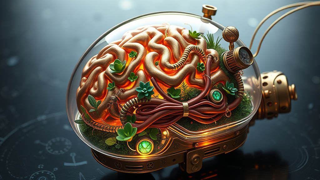 3D render of a sci-fi baroque concept design of an anatomically correct brain device fused with a lush terrarium ecosystem, featuring steampunk aesthetics and intricate copper and brass details. The brain is encased within a transparent dome revealing a miniaturized biome of plants and tiny robotic insects. Tubes and gears interweave symbiotically with the neural structure, producing a pulsating luminescence. The surface is adorned with ornate engravings and filigree, giving a sense of scientific innovation. The entire composition is hyper-detailed and photorealistic, showcasing a seamless blend of biology and technology, where art meets science in a futuristic masterpiece.