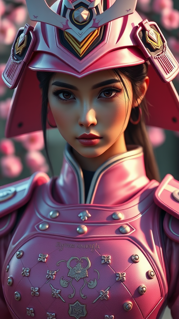 3D render of a woman in sleek pink samurai armor, intricate detailing on the chest plate and helmet, glinting under soft ambient light, background with subtle hints of cherry blossoms, capturing a serene yet fierce expression, close-up shot in raw style, aspect ratio 9:16.