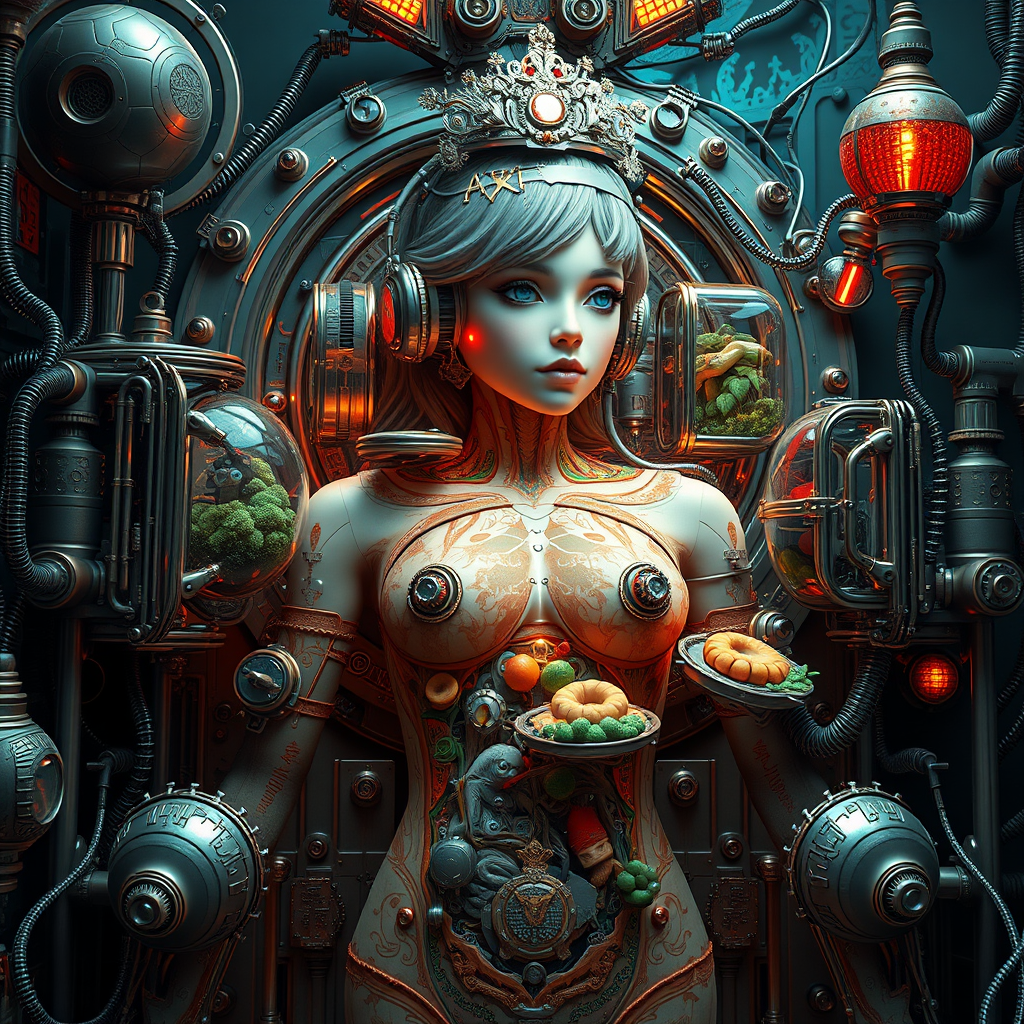 3D render of an incredibly detailed surreal airbrushed artwork featuring dopamine flowing through a sci-fi baroque concept design. It portrays an anatomically accurate full-body device resembling an 18-year-old girl, incorporating elements like terrariums and steampunk with intricate and scientific details. The scene is hyper-detailed and photorealistic with ambient lighting, inspired by the styles of Ilya Kuvshinov, Artgerm, Alphonse Mucha, and Greg Rutkowski. There are subtle creative adjustments, retaining the original vision but enhancing its visual storytelling. The piece includes a nod to artistic signatures, though it maintains clarity and quality throughout.