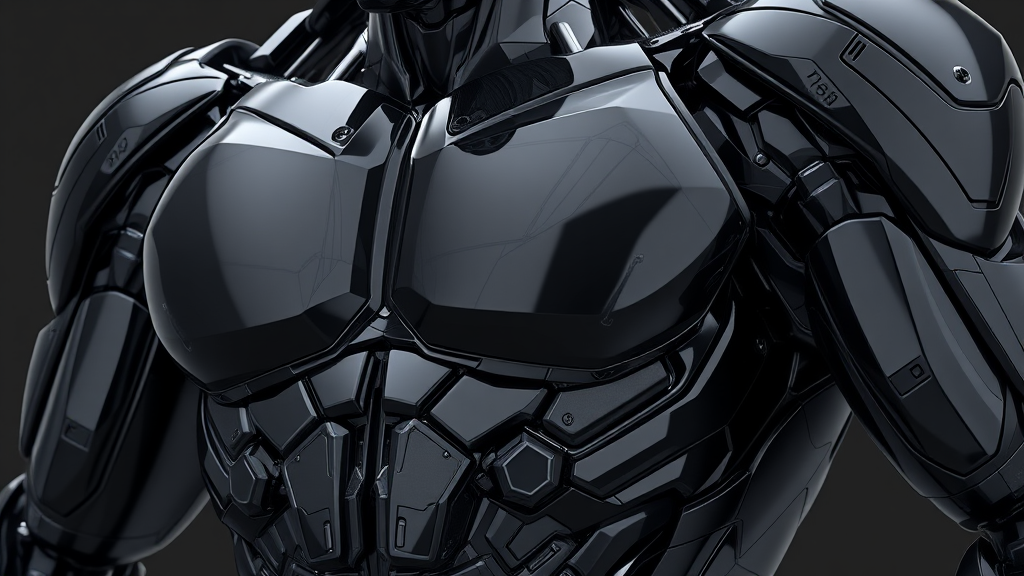 3D render, premium quality, hyper-realistic, highly detailed, half-body shot: striking muscular humanoid villain robot, sleek angular lines, glossy dark materials, elaborate intricate details, lifelike organic textures, elevated reflection properties.