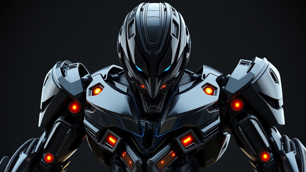3D render, premium quality, hyper-realistic, highly detailed, half-body shot: charismatic and powerful humanoid villain robot, sleek angular design, glossy dark materials, complex minute details, lifelike textures, high-intensity reflections, subtle glowing elements.