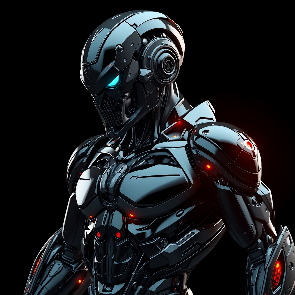 3D render, premium quality, hyper-realistic, highly detailed, half-body view: captivating and muscular humanoid villain robot, sleek contours, glossy dark surfaces, complex minute details, life-like organic textures, high degree of reflectivity, enhanced by creative metallic embellishments and subtle glowing accents, maintaining an air of futuristic menace.