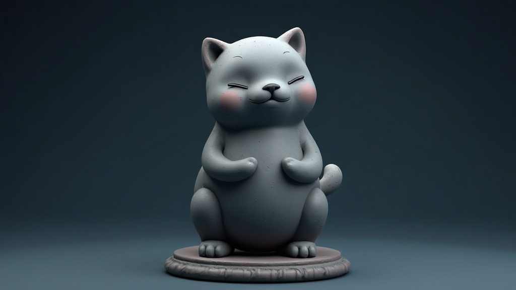 View this AI-generated image featuring a stylized 3d rendered sculpture of a plump whimsical cat standing upright on an ornate circular base the model features a smooth marble like texture with subtle speckling and a visible quad polygon topology that offers a gentle wireframe overlay appearance the
