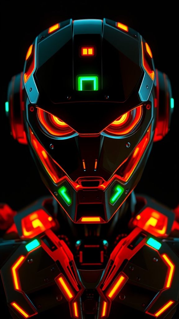 3D rendering featuring a highly detailed robot in a front view, showcasing its upper body with a striking neon glow in deep orange and green hues. Its glistening eyes fixate with an intense gaze, set against a black backdrop. The scene utilizes dramatic, low-key lighting to enhance texture and contrast, relying on RTX shader technology and Unreal Engine 5 for complex hyper-realistic details. The emphasis is on intricate textures with many details, maintaining a deep contrast throughout the composition. A touch of creative flair is added with subtle blue accents intertwining with the orange and green, creating a unique visual harmony.