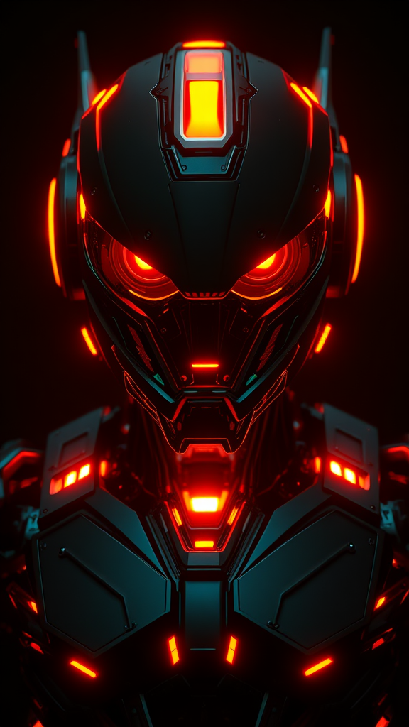 3D rendering, futuristic robot, captivating front view, upper-body focus, radiant neon aura with vibrant orange and emerald highlights, intense gaze, luminous eyes, set against a pitch-black background, dramatic and moody lighting with pronounced contrast, low-key ambiance, intricate texture and high contrast, utilizing RTX shader, powered by Unreal Engine 5, richly detailed and complex, hyper-realistic finish, slight creative deviations for uniqueness, controlled chaos at 1.3, aspect ratio 9:16, raw style, artistic stylization at 700.