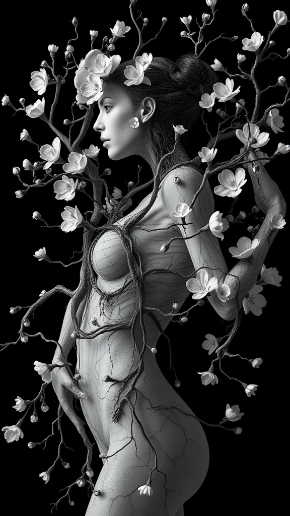 3D woman intertwined with floral and human-like branches, inspired by medical imaging aesthetics; in the style of Sebastian Errazuriz and Michael Eastman, featuring intricate anatomical details and black and white illustrations, with a cinematic depth and ballet-like elegance, enhanced by advanced rendering techniques.