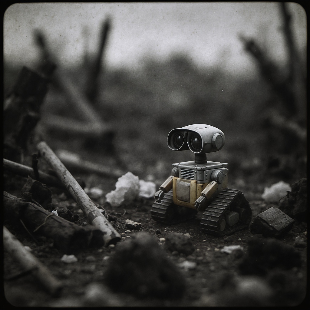 In a dramatic 50mm film photography style, a small, cute mechanical robot reminiscent of Wall-E is placed on a World War I battlefield. Captured as an old photo, the scene exhibits a depth of field with a tilt-shift effect, showcasing bokeh and an intricate focus. The robot appears photorealistic, rendered with octane for heightened realism, amidst dramatic lighting that emphasizes the debris and trash surrounding it. The wide-angle shot conveys an award-winning composition, evoking the somber atmosphere of war with detailed, intricate surroundings while maintaining a whimsical, thought-provoking contrast.
