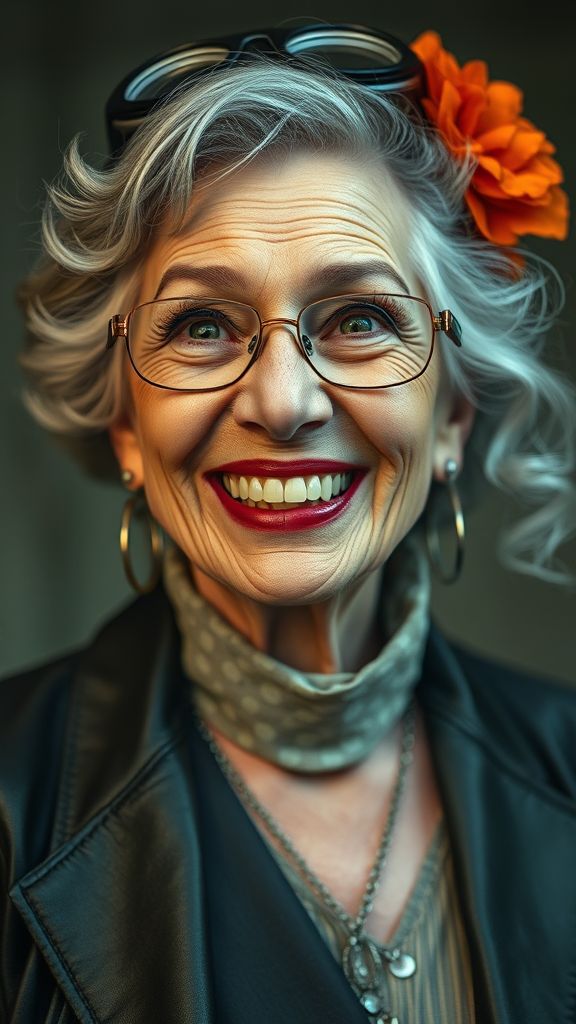 70-year-old, jovial woman with a cheeky smile, inspired by the styles of Mark Citret, Guillermo Espinosa, and Carl Frederik von Breda. She embodies a touch of steampunk flair, set against a backdrop of negative space with cinematic, color-graded tones. Captured in an analog style, this hyper-realistic, ultra-high-definition photo features detailed, life-like textures of her expressive face. Photographed with a Fujifilm XT3 and Olympus XA2 camera using an 85mm lens at F/2.8, the image is suffused with soft, volumetric lighting and subtle fog, accentuated by moist reflections in a shallow depth of field. The composition highlights her fashion-forward appearance, drawing from the vibrant Thomson MO5 color palette and modular constructivism for an editorial cover art finish. The overall image combines elements of photorealism with a touch of psychedelic mystique, ensuring a captivating, high-quality visual narrative.