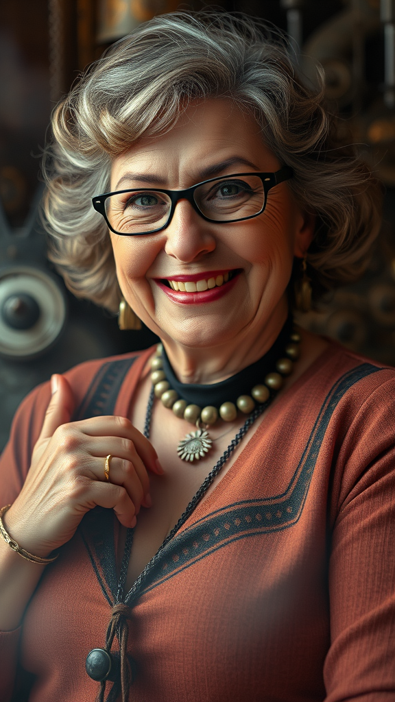 70-year-old, pleasantly plump woman with a cheeky smile, inspired by the styles of Mark Citret and Carl Frederik von Breda. The image blends the essence of Ed Benedict's whimsical touch, Guillermo Espinosa's flair, and Colin Campbell Cooper's attention to detail. Captured in a steampunk setting with emphasis on negative space, the scene is color graded to enhance its cinematic quality, reminiscent of an analog film still. This hyper-realistic, ultra-high-definition portrait, shot with the Fujifilm XT3 and the classic Olympus XA2 Camera using an 85mm F/2.8 lens, features soft lighting and realistic film grain. The HDR effect highlights the volumetric lighting and subtle fog, creating a moist ambiance with reflections that add depth. The composition, inspired by Modular Constructivism and the vibrant Thomson MO5 color palette, showcases an editorial fashion aesthetic with a psychedelic twist. The focus is on the woman's expressive, beautifully detailed face and pretty hands, captured with a shallow depth of field for a dreamy yet hyper-detailed effect. The cinematic composition ensures the image serves as striking cover art, capturing the essence of creativity and realism while avoiding common pitfalls like digital artifacts, poor lighting, or disproportionate anatomy.