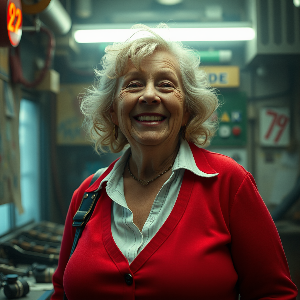 70-year-old woman with a blubbery figure and a cheeky smile. The setting is inspired by the artistic styles of Mark Citret, Guillermo Espinosa, Carl Frederik von Breda, Ed Benedict, Sebastian Errazuriz, and Colin Campbell Cooper with a touch of steampunk elements. Captured in cinematic film style, the image presents an analog aesthetic, hyper-realistic UHD faces, and 8k resolution. Utilizing a Fujifilm XT3 camera with an Olympus XA2 for a soft, high-quality finish, the shot boasts a shallow depth of field and HDR effects. The scene is enriched with color grading, volumetric lighting, fog, and reflections, with an emphasis on modular constructivism and a Thomson MO5 color palette. This fashion-inspired photograph presents an editorial cover art feel, featuring cinematic composition and realistic textures. The image avoids flaws such as deformations, low quality, or amateur effects, presenting a polished, professional output.