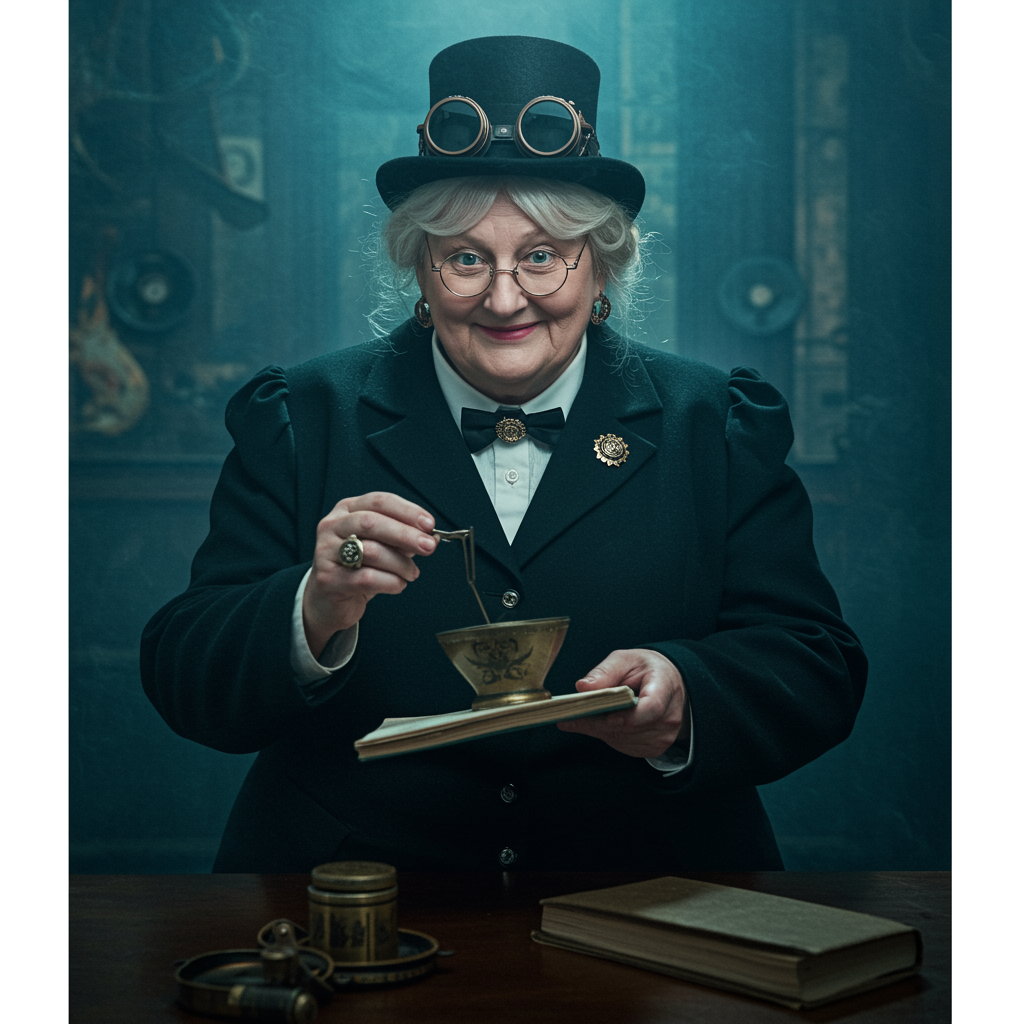 70-year-old woman with a blubbery physique, embodying the role of a cheeky teacher with a knowing smile, influenced by the styles of Mark Citret, Guillermo Espinosa, Carl Frederik von Breda, Ed Benedict, Sebastian Errazuriz, and Colin Campbell Cooper. Infused with steampunk elements, the composition uses negative space and is color-graded to create a cinematic film still, reminiscent of an analog style with a hyper-realistic, UHD quality. Captured with a Fujifilm XT3 and an Olympus XA2 Camera using an 85mm lens at F/2.8, the image is characterized by soft lighting, film grain, and HDR - showcasing a hyper-realistic depiction with volumetric lighting and fog. Reflections play a key role, with a shallow depth of field adding to the realism. The scene integrates absurd resolution, fashion shot qualities, and a psychedelic edge, utilizing a Thomson MO5 color palette within a modular constructivism framework. The result is a realistic and artistic editorial cover art piece, avoiding imperfections such as low quality, errors, or poorly executed elements while maintaining the integrity and core concept of the original inspiration.