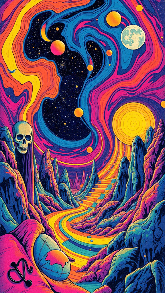 70s rock band album cover depicting a swirling psychedelic landscape with vibrant, bold colors; featuring surreal, vintage-inspired elements like kaleidoscopic patterns and abstract musical motifs against a cosmic backdrop, capturing the essence of a bygone era through imaginative and vivid artistry