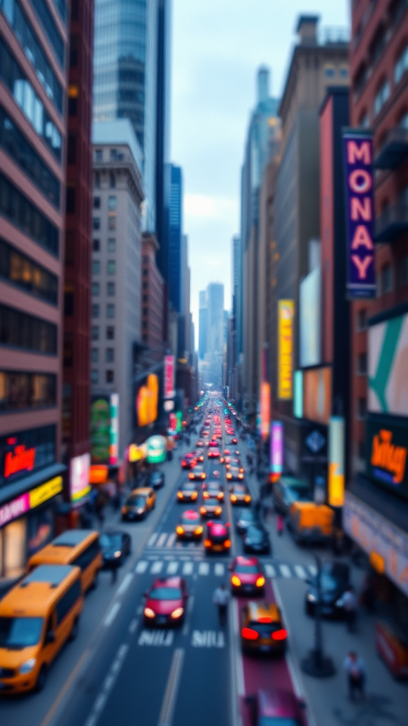 8bit inspired photography of New York with a tilt shift effect, capturing the vibrant cityscape with miniature details and colorful pixel art essence.