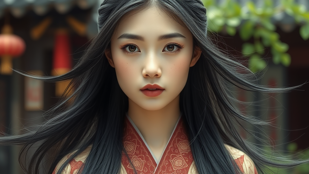 8K, crisp focus, gentle illumination, young Chinese woman, traditional Chinese attire, flowing black hair, traditional Chinese house backdrop, meticulously detailed, artistic style, vivid illustrations, subtle imperfections on skin, natural texture, authentic appearance, serene environment, elements of nature, artistic analog effects, culturally rich setting, harmonious composition, timeless elegance
