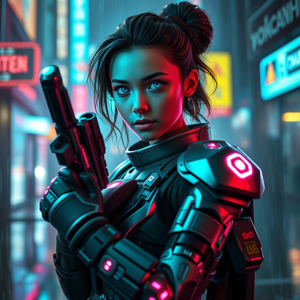 8k depiction of a stunning young girl, embodying a goddess-like presence, clad in sci-fi medium armor glowing with neon lights, possessing ethereal white eyes. Situated in an urban setting in slow motion amidst rain and vibrant neon lighting, with a whole-body view in a dynamic posture, she holds a futuristic laser gun. Her attire, a mix of latex and futuristic army uniform, perfectly frames a symmetrical face with a confident smile, exuding a cyberpunk aesthetic ready for battle. Enveloped in fog and reflections, the scene captures intricate details reminiscent of Star Wars, evoking nostalgia with a dynamic hairstyle. Rendered in HDR, the realistic and detailed skin displays an art style trending on ArtStation and CGSociety, with influences from artists like Artgerm, Greg Rutkowski, and Viktoria Gavrilenko. This photorealistic 3D artwork reveals a dramatic scene with rich details and creativity, maintaining harmony in composition and elegance in design.