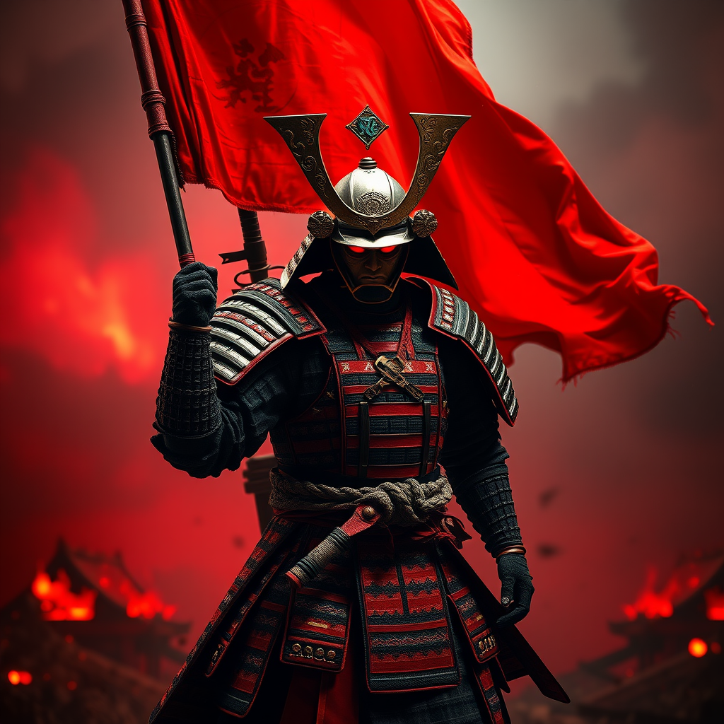 8k photography ultra-realistic samurai warrior carrying a majestic war flag banner, full body view of the intricate red and black armor with exquisite detailing, cinematic lighting creating a dramatic high-definition scene, vibrant illumination capturing every hyperrealistic detail, trending on art station with unmatched focus, enhanced with the power of unreal engine 5, enveloped in a dark and intense atmosphere, depth of field showcasing a red war-torn landscape, smoke and embers swirling around, slight blur for a cinematic effect, set in a dynamic 9:16 aspect ratio.