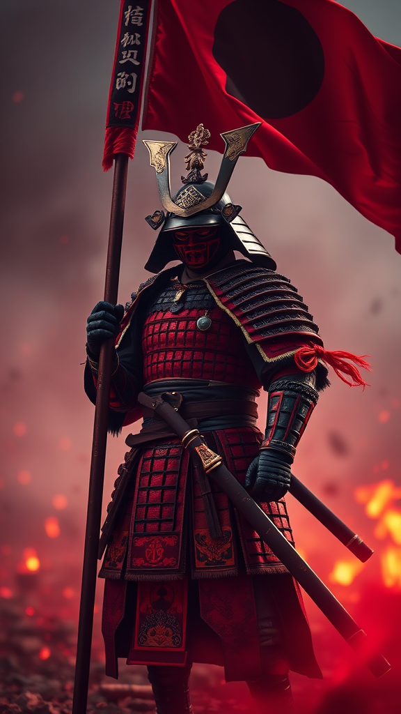 8k photography ultra-realistic samurai warrior holding a majestic war flag, clad in full body intricately detailed red and black armor, illuminated by ornate cinematic lighting. The scene is rendered in high definition with vibrant illumination, capturing high details, akin to trending art station masterpieces. The warrior stands focused amidst a hyperrealistic atmosphere, emphasizing a blend of dark tones and depth of field. Set within a red war-torn landscape, the air is thick with swirling smoke and glowing embers, adding a sense of movement and drama. The environment is subtly blurred to emphasize the warrior, reminiscent of Unreal Engine 5 graphics.