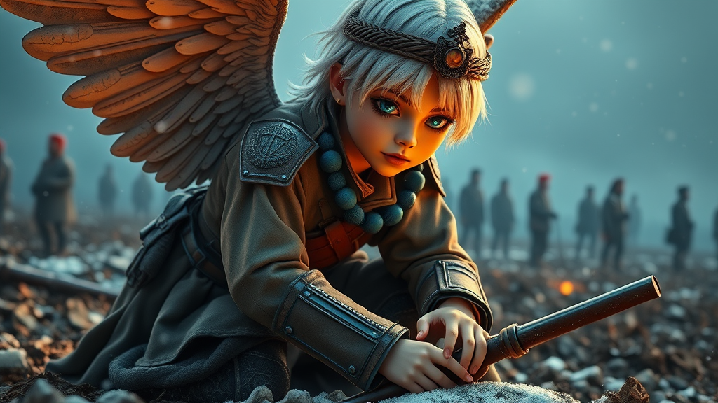 8k pinup of the most defiant Napoleonic angel in the world, ultra-detailed, 8k uhd, dslr, soft lighting, high quality, film grain, Fujifilm XT3, best quality, beautiful lighting, extremely detailed, hyper detailed, revolutionary French angel kneeling on a battlefield with corneo_runny_makeup and muddy clothes, blue Napoleonic war ornaments, reflective eyes with the same eye color for both eyes, dramatic lighting, realistic skin, warfare under a blizzard, professional majestic impressionism oil painting by Waterhouse, John Constable, Ed Blinkey, Atey Ghailan, by Jeremy Mann, Greg Manchess, Antonio Moro, trending on ArtStation, trending on CGSociety, intricate, high detail, dramatic, white hair, school uniform, cartoon, weird colors, animated style with an emphasis on facial expression and posture.