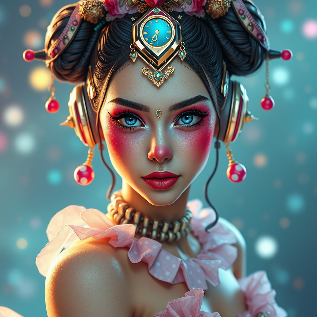 8k portrait of a stunning galactic prima ballerina with a clowncore twist, a rich blend of Russian cyborg college girl aesthetics with exquisite details adhering to the golden ratio. Envision a fusion of sci-fi, fantasy, and cyberpunk elements, resulting in an intricate and lavish digital painting. Drawing inspiration from Ever After High, the piece is rendered with octane techniques and showcases artstation-level concept art quality. The illustration, crafted with smooth and sharp focus, reflects the artistic styles of Artgerm, Loish, and WLOP, bringing to life a captivating and imaginative scene.