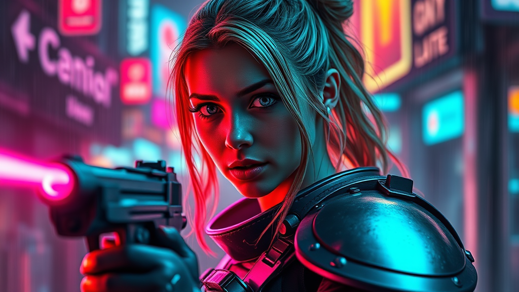 8k portrait of the most captivating young woman, embodying a goddess-like presence, donned in sci-fi medium armor adorned with vibrant neon lights. Her white eyes shine with an inner light amidst an urban setting captured in slow motion, bathed in the glow of neon and rain with bloom effects. Featuring her entire body in a dynamic pose, she wields a sci-fi laser gun, her attire a mix of latex and futuristic textures. Her perfectly symmetrical face bears a confident smile, exuding a cyberpunk aura, ready to confront any challenge. Enveloped in fog and reflections, the scene brims with intricate detail reminiscent of Star Wars, her futuristic army uniform conveying a sense of nostalgia. Her dynamic hairstyle is captured in HDR, achieving a photo-realistic quality with exceptionally detailed skin and lens flares. Trending on ArtStation and CGSociety, the image exemplifies intricate, high-detail, dramatic, photorealistic art, drawing inspiration from artists like Artgerm, Greg Rutkowski, and Viktoria Gavrilenko. This captivating vision embraces elements of cartoon and 3D with a touch of multiplicity, presenting an array of clones reflecting diverse colors captured with precision.