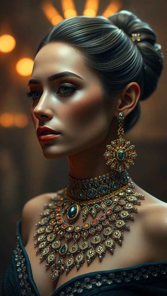 8k resolution depth of field atmospheric haze advanced global illumination dynamic lighting with optimal illumination featuring volumetric lighting and ultra-realistic high-definition 8k photorealism embodying hyper-realism intricate photon mapping and physically-based rendering focusing on detailed jewelry showcasing exquisite craftsmanship, robust negative space counterbalance, enhanced tonal contrasts, expertly refined imaging avoiding distortion or negative anatomical features ensuring impeccable photorealistic presentation with emphasis on artistic integrity and precision.