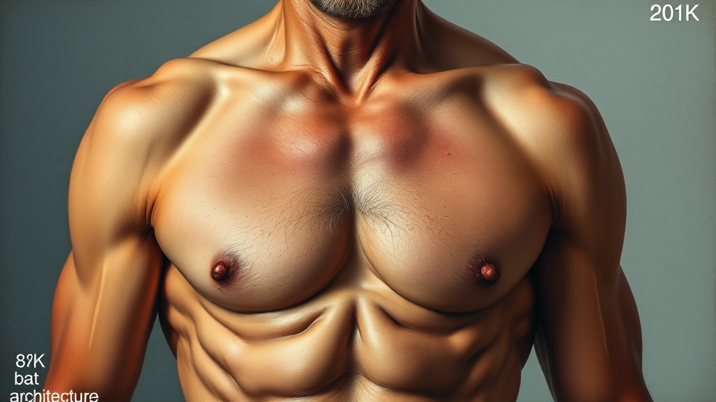 8K resolution, sharp focus, soft lighting, gradient background, intricate paintings, detailed sketches, realistic skin texture with spot marks, acne, and blemishes, depicting age signs, subtle body imperfections like manboobs, double navel, and muted arms, with natural analog effects, featuring realistic human elements such as nipples, conveying a sense of raw, unfiltered artistry, bad architecture elements, discrete watermark to maintain artwork's authenticity, minor imperfections, subtle body features alongside a composed six-pack, capturing a blend of realism and artistic creativity.