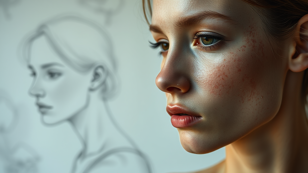 8K, sharp focus, soft lighting, gradient background, paintings, sketches, slight imperfections, realistic skin texture with spots and blemishes, natural body features, subtle analog effects, human figure study, artful representation, muted tones, balanced composition, intriguing design elements, abstract architectural hints, creative watermark integration, artistic anatomy.