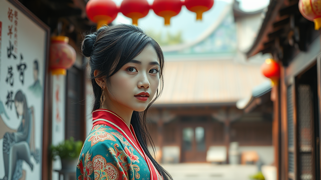 8K sharp focus, soft lighting, young Chinese woman in traditional dress, black hair, traditional Chinese house in the background, vibrant colors, paintings and sketches, natural skin texture, analog effects, elegant aesthetic, harmonious architecture, artistic ambiance.