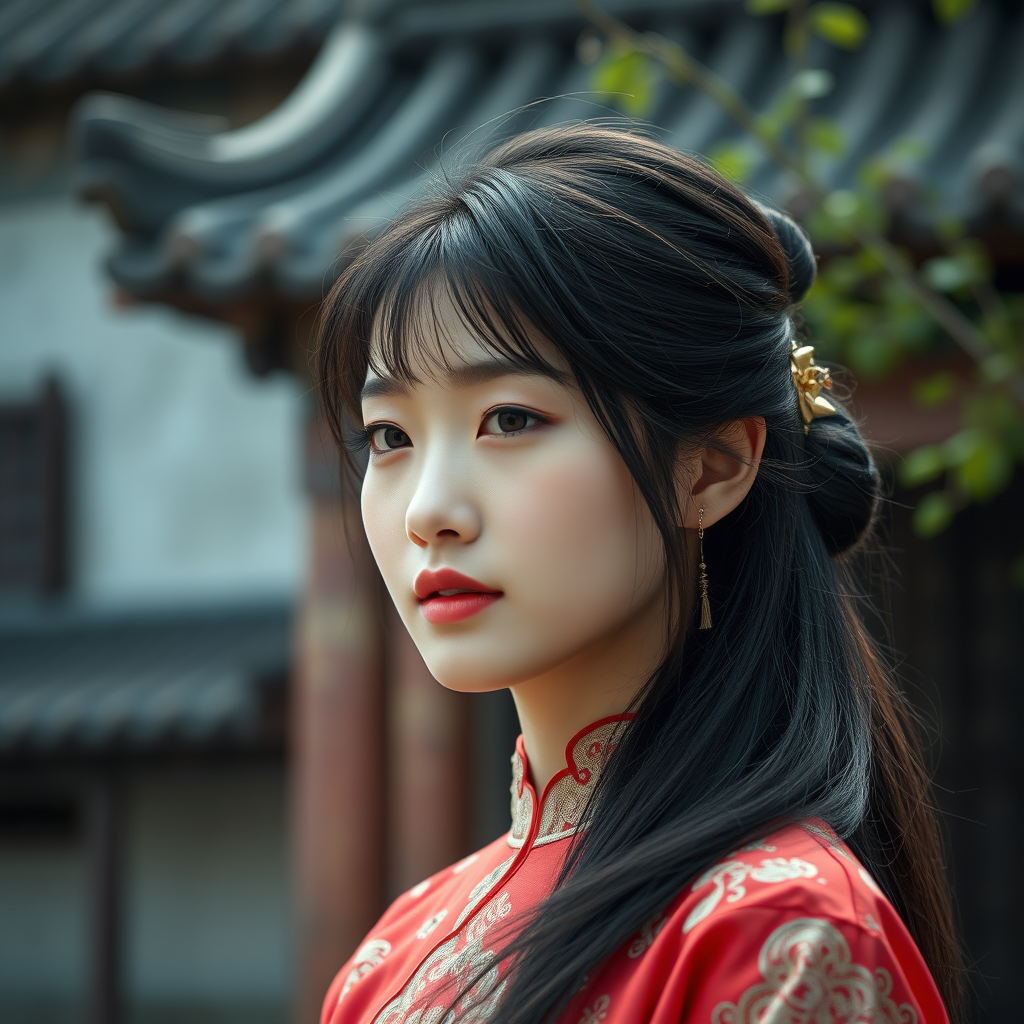 8K sharp focus soft lighting young Chinese woman wearing a traditional Chinese dress black hair in front of a traditional Chinese house in the background serene atmosphere clear skin youthful radiance harmonious scene gentle architectural elements natural expressions elegant composition nuanced colors and textures timeless beauty and cultural heritage authenticity without embellishment captivating portrayal