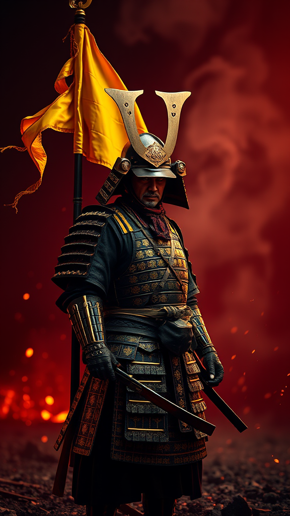 8k ultra realistic depiction of a samurai warrior adorned with a striking yellow war banner, full body, showcasing intricately detailed yellow and black armor under ornate cinematic lighting, high definition. The scene captures vibrant illumination, trending on art platforms, exhibiting hyperrealistic high details, focused imagery. Crafted using unreal engine 5, set against a dark backdrop featuring lumen reflections and depth of field photography. The warrior stands within a reddish war-torn landscape, with smoke trailing upwards and embers dancing around, imbuing the image with a cinematic essence.
