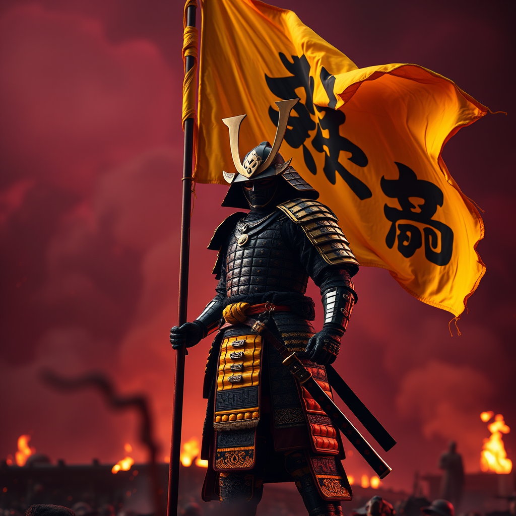 8k ultra realistic depiction of a samurai warrior standing tall with a striking yellow war flag banner, showcasing full body intricate yellow and black armor. The scene is enhanced with ornate cinematic lighting, vibrant illumination, and high definition, creating a hyperrealistic and highly detailed image. The focus is sharp as if rendered in Unreal Engine 5, with an emphasis on dark, moody atmosphere highlighted by lumen reflections. The background features a reddish, war-torn environment filled with smoke and embers, adding to the cinematic feel. Depth of field is carefully employed to draw attention to the warrior, amidst the chaos. This visual masterpiece is trending on art platforms, capturing a dramatic and immersive moment.