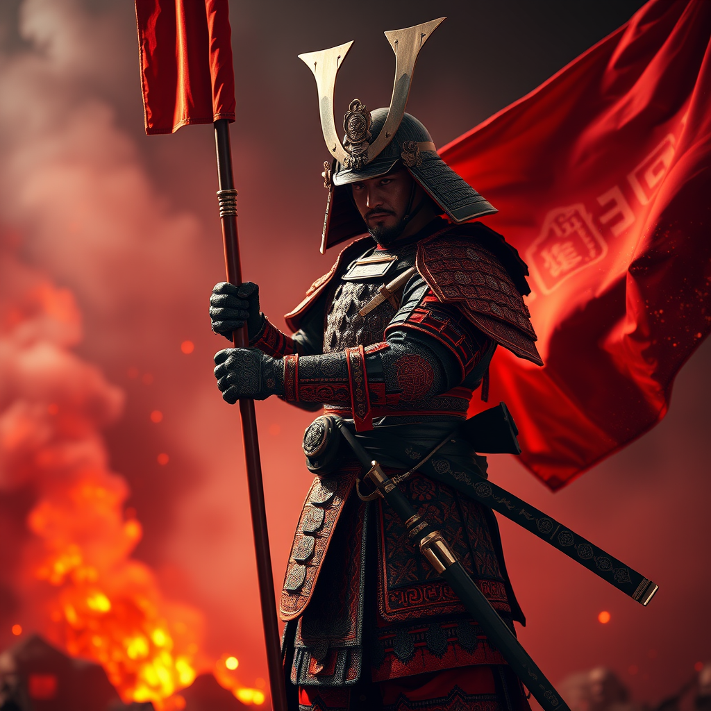 8k ultra-realistic photography of a full-body samurai warrior, wielding a war flag banner, dressed in intricate red and black armor with detailed engravings. The scene is illuminated by stunning, ornate cinematic lighting, showcasing high-definition and vibrant colors. The warrior stands in a striking posture, set against a dark, red war-torn environment filled with smoke and embers, creating a dramatic atmosphere. Utilizing the power of Unreal Engine 5, the image boasts hyperrealistic details and sharp focus, with a subtle blur enhancing the depth of field. The artwork channels a sense of intensity and power, trending on art platforms for its dynamic composition and immersive storytelling -- ar 9:16.
