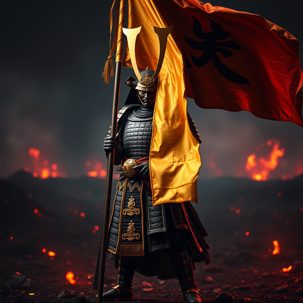 8k ultra realistic samurai warrior holding a golden war flag, standing tall in intricately detailed black and gold armor, with cinematic lighting casting vivid highlights, high definition with vibrant illumination, hyperrealistic and trending on art station, featuring high detail and focused composition using unreal engine 5. Set against a dark, war-torn landscape with rich reddish hues, engulfed in smoke and swirling embers, utilizing depth of field and lumen reflections for dramatic photography effect, capturing the essence of a fierce battlefield, --ar 9:16.