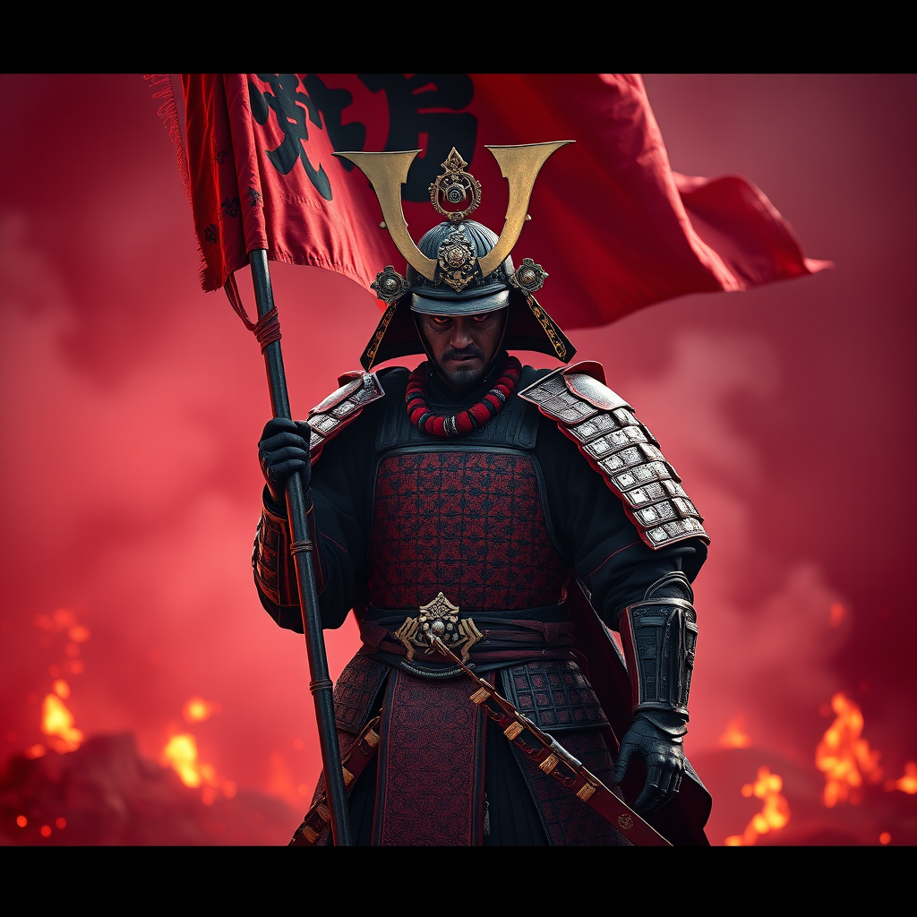 8k ultrarealistic photograph of a full-body samurai warrior holding a war flag banner, wearing intricate red and black armor, featuring ornate cinematic lighting with high-definition, vibrant illumination. The scene is hyperrealistic, with high detail and sharp focus, as if rendered in Unreal Engine 5. Set in a red war-torn environment filled with smoke and embers, adding depth of field and a slight cinematic blur. The overall atmosphere is dark yet captivating, with a dramatic play of shadows and highlights, encapsulating the warrior's fierce determination.