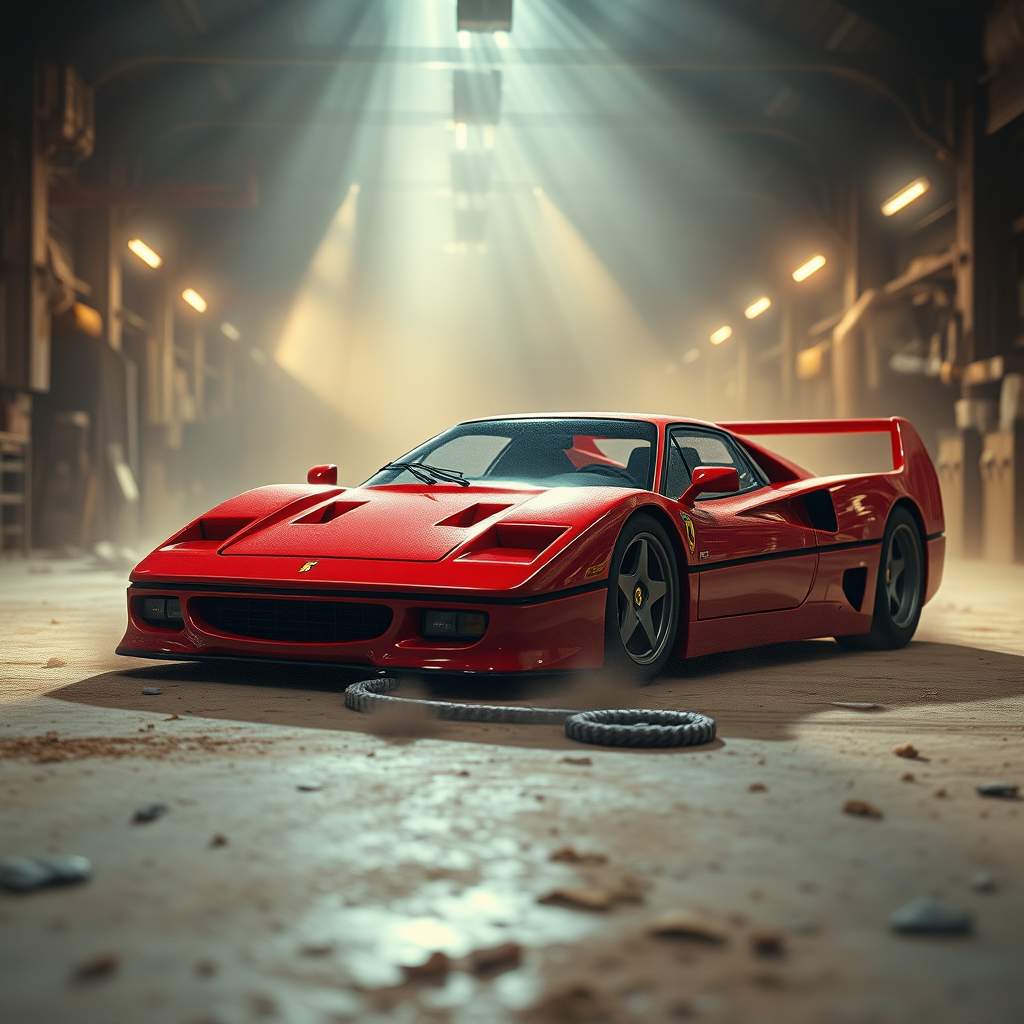 90's found footage VHS, vintage film grain and noise, red Ferrari prominent in a vast garage setting, enriched with atmospheric volumetric lighting, creating a dusty, cluttered ambiance; soft, diffused lighting adds a gentle haze, ultra-realistic rendering with a cinematic touch, radiant beams of light breaking through the dust, high-resolution 3D render with artstation quality; detailed matte concept art with a subtle sense of Exaggeration; visually light Aesthetic akin to magazine spreads, evocative Backlight and magical beams illuminating the scene, dust particles alight in the beams, a color palette with light hues; hints of a toy car and a 2D cartoon style peek in, reminiscent of anime characters, creatively cropped to suggest a mysterious out-of-frame world.