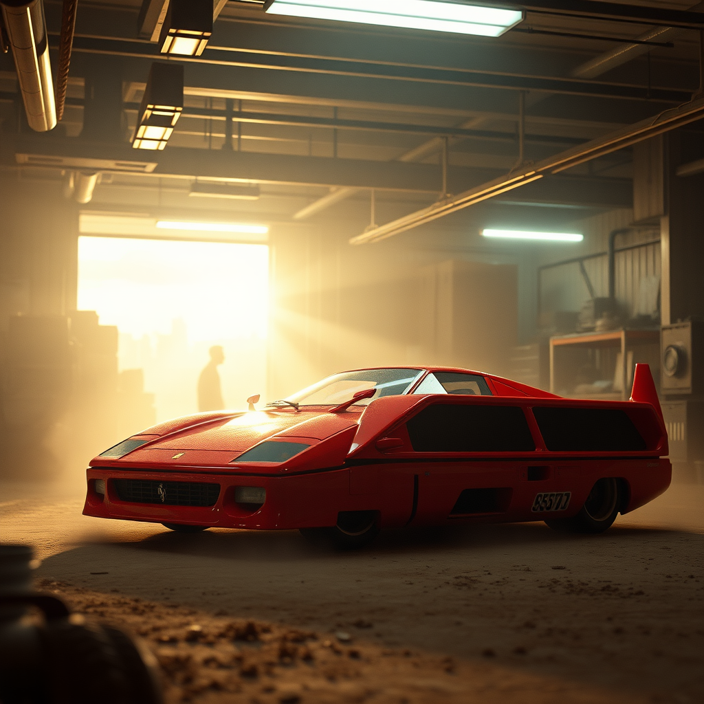 90's inspired found footage VHS aesthetic, dense film grain and noise, ultra-realistic cinematic feel, a vibrant red Ferrari in an expansive garage filled with volumetric lighting and thick dust, creating a cluttered and messy environment, softened lighting with a hazy atmosphere, radiant light rays breaking through, high-resolution 3D render in an artstation matte style, highly detailed concept art with a hint of exaggeration, capturing a light aesthetic reminiscent of a magazine spread, magical backlit light rays filtering through dust, playful touch of color, slightly cropped, hint of a toy car and elements of 2D, anime-styled cartoon.