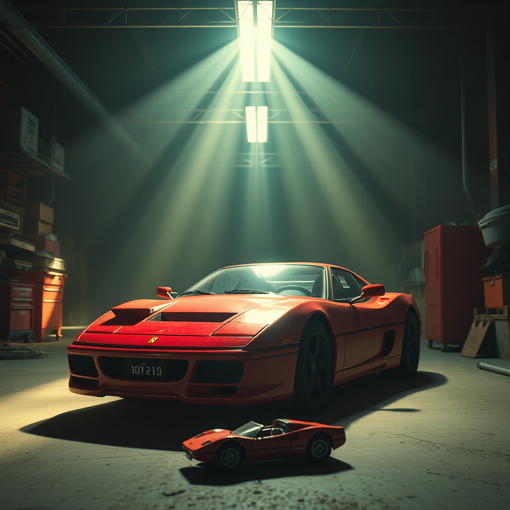 90's inspired found footage VHS style, embracing film grain and noise with a cinematic touch, featuring a red Ferrari in a vast, cluttered garage. The scene is filled with volumetric lighting, emphasizing dust and creating a soft, hazy ambiance. Ultra-realistic details stand out amidst the radiant light rays, reminiscent of a high-res, 3D render showcased on ArtStation. The space is captured in matte, highly detailed concept art, where exaggeration meets light aesthetics. It feels like a magazine spread with backlit elements casting magical beams, dust floating visibly in the streams of light. The colors play delicately across the scene, creating an ethereal atmosphere. Within this realistic setting, there's a whimsical twist— a toy car, with a 2D cartoon or anime style, appears cropped or slightly out of frame, adding an unexpected layer to this narrative tableau.