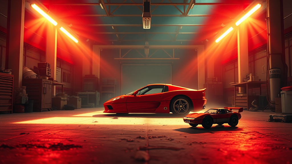 90's inspired VHS found footage feel, with film grain and noise for a nostalgic, cinematic touch. A red Ferrari sits in an expansive garage, surrounded by volumetric lighting that highlights the dust in the air, creating a hazy, soft-lit atmosphere. The scene is ultrarealistic, using high-res, 3D rendering techniques reminiscent of ArtStation and matte painting styles. Clutter and mess fill the space, adding to the authenticity, while vibrant light rays and radiant beams cut through the scene, amplifying the magical ambiance. This concept art incorporates a light aesthetic often seen in high-end magazines, with intentional backlighting casting glowing rays that accentuate the dust in the beams, creating a dreamlike effect. Although the focus is on a life-size car, a toy car element introduces a touch of whimsy, blending the boundaries of 2D, cartoon, and anime styles. This cropped, out-of-frame composition teases a narrative, using subtle exaggeration and an easygoing, colorful palette to evoke emotion and curiosity.