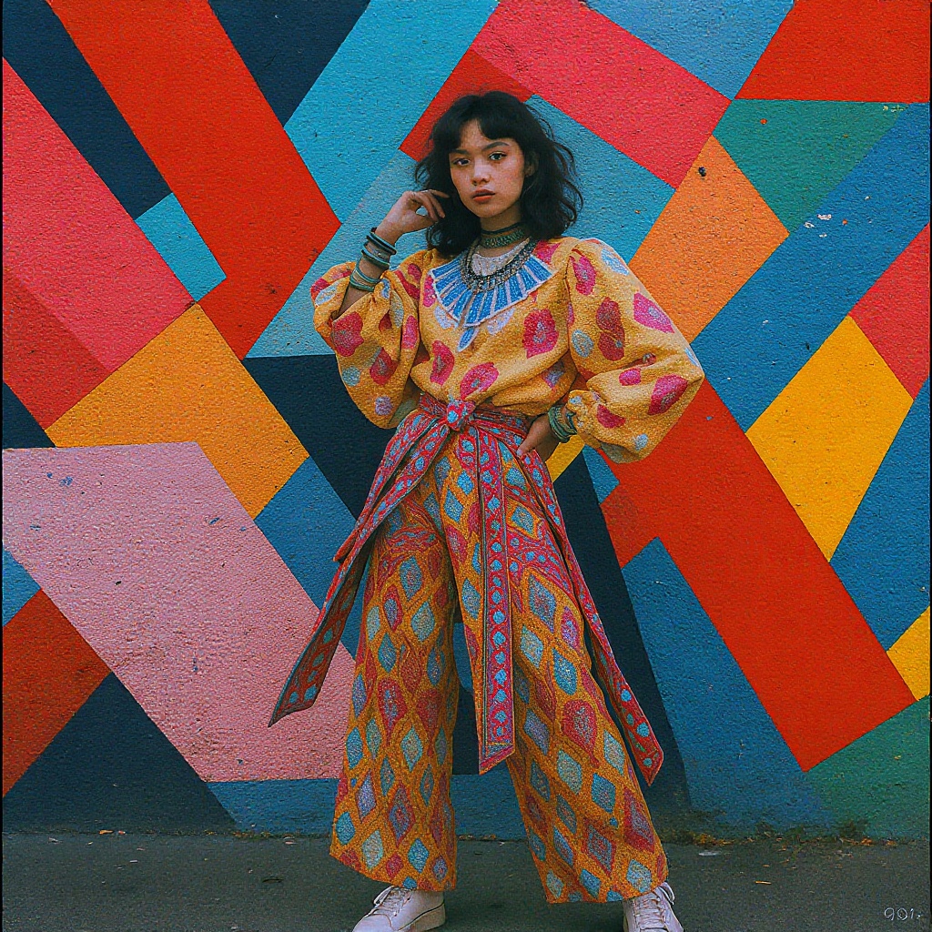 View this AI-generated image featuring a dynamic 90s street photographer captures a self assured model in the vibrant streets of santiago posing against an intriguing backdrop of abstract graffiti composed entirely of bold vivid geometric shapes the model s attire reminiscent of the eclectic styles