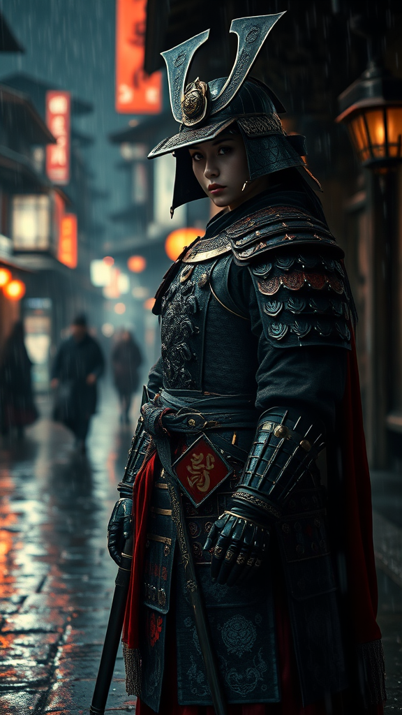 A 12th-century female samurai adorned in intricate black and crimson armor stands poised in a dark, rain-soaked city, styled reminiscent of Greg Rutkowski, Guweiz, and Yoji Shinkawa. Her armor gleams under cinematic lighting, each detail meticulously rendered, capturing the essence of hyperrealism. The scene is set in a bustling, ancient urban landscape with depth of field enhancing the atmospheric ambiance. Lumen reflections dance on wet cobblestones, adding layers of complexity to the environment. The rain cascades down in a mesmerizing display, and the overall composition exudes an undeniable allure, blending historical authenticity with stunning visual drama in 8K ultra detail.