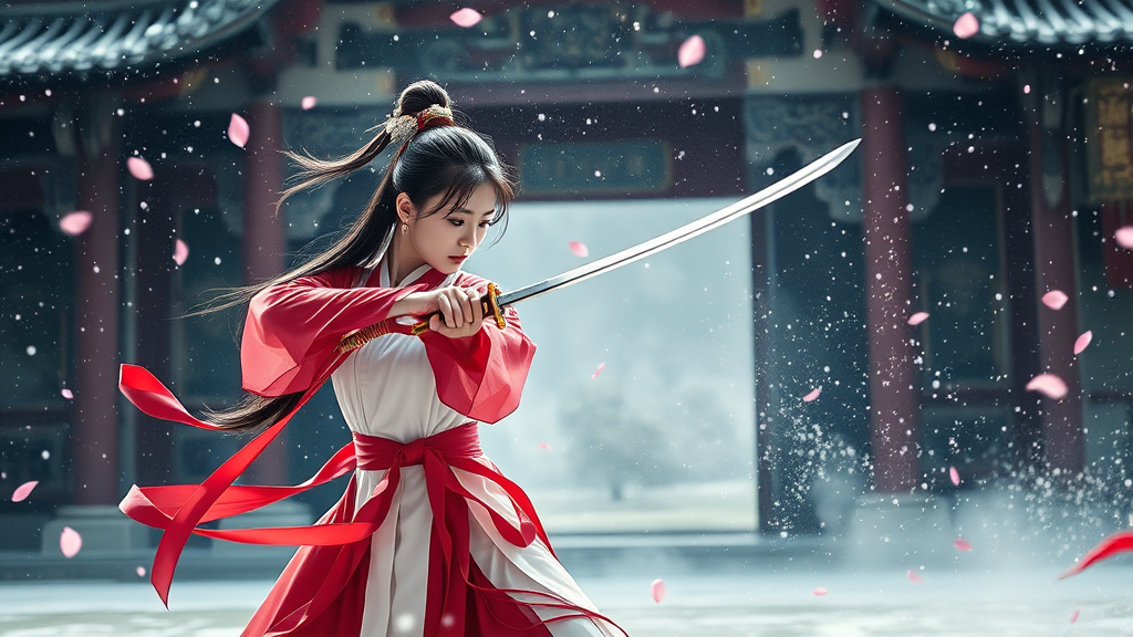 A 16-year-old Chinese girl, elegantly poised in Hanfu, stands fiercely in the heart of an ancient temple. Snow and flower petals whirl around her like a mystical dance. She wields her sword with grace and precision, mastering the art of martial swordplay as she defends herself from unseen forces. The temple hums with an ethereal aura, while vibrant points of light dot the air, reminiscent of a Chinese fairy tale. The scene is alive with high detail; dynamic movements captured in a cinematic flair, shadows and light weaving a stunning tapestry of drama and realism, as though shot on a classic 35mm film.
