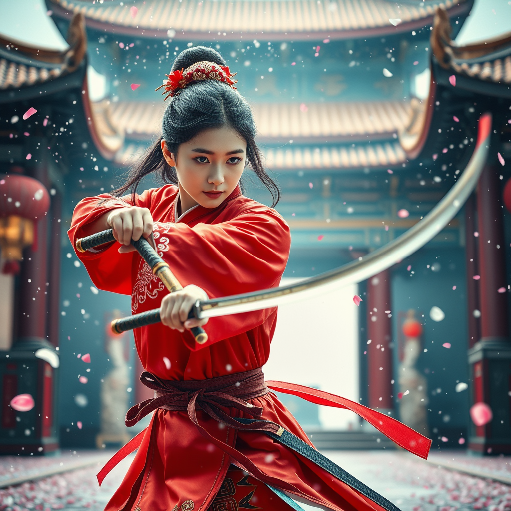 A 16-year-old Chinese girl, strikingly beautiful in traditional Hanfu attire, skillfully wields a sword as she defends herself in the center of a grand temple. Snowflakes and flower petals swirl in the air around her, creating a magical, almost otherworldly atmosphere. The scene, set against a vibrant backdrop reminiscent of a Chinese fairy tale, dazzles with colorful points of light. Captured in a dynamic, cinematic style, the image is rich in detail, with dramatic lighting and realistic shadows enhancing the intense realism of the moment, as if shot on a 35mm film, every frame infused with an exquisite blend of grace and power.