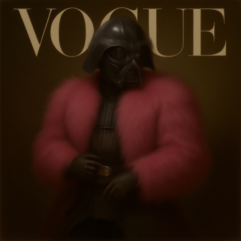 A 16th-century inspired painting featuring Darth Vader adorned in luxurious pink fur, striking a fashion model pose reminiscent of a Vogue cover, set against a classical Renaissance background with rich textures and intricate detailing, embodying an avant-garde fusion of iconic sci-fi and historical elegance.
