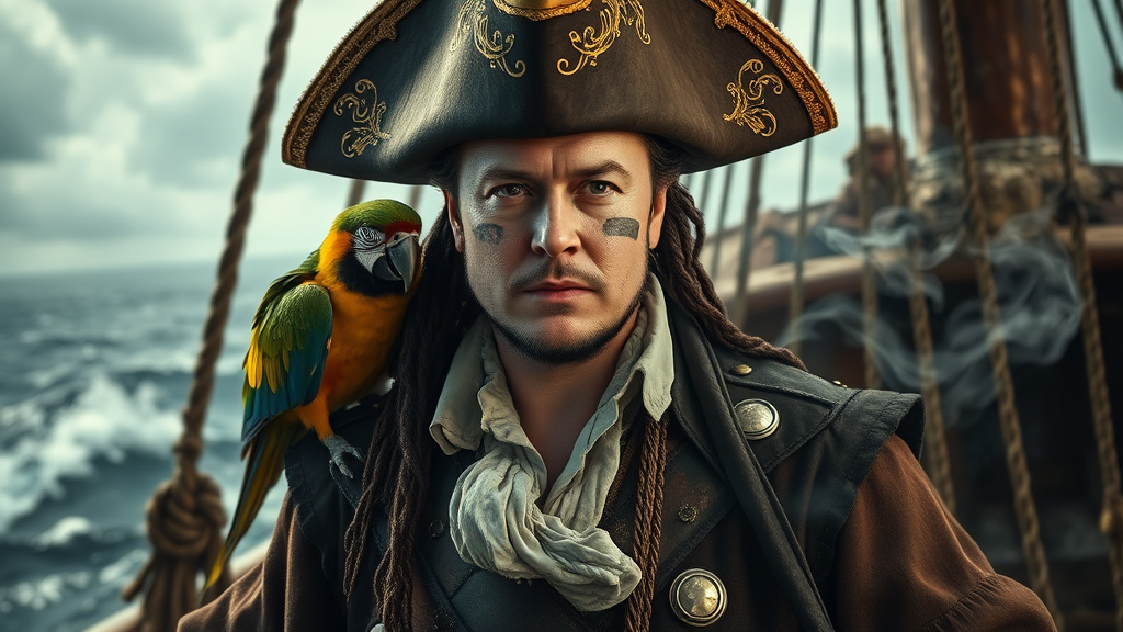 A 1700s pirate captain resembling Elon Musk stands confidently on the deck of a weathered ship, a vibrant parrot perched on his left shoulder. His sharp eyes peer out from beneath a wide-brimmed hat adorned with intricate gold embroidery. A deep scar cuts across his cheek, adding to his roguish aura. The cinematic light streams in dramatically from the left, casting deep shadows and highlighting the rugged textures of his sun-weathered face and richly detailed attire. Thick swirls of smoke encircle him, adding mystery and depth to the scene. The background hints at a stormy sea, with waves crashing against the ship, all captured in the rich, moody tones reminiscent of a Rembrandt painting.