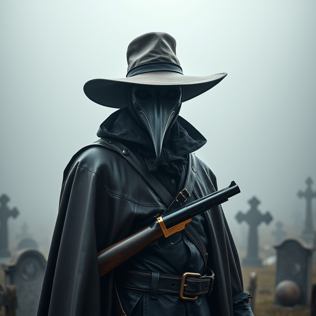 A 17th century plague doctor stands ominously in a fog-shrouded graveyard, wearing a wide-brimmed hat and a bird-like mask that partially conceals a visage of stoic determination. The leather cloak rustles softly as the figure surveys the somber scene, a gleaming 6-shooter revolver holstered at their side, an unusual yet intriguing anachronism in this medieval setting. The atmosphere is richly detailed and imbued with an EPIC fantasy allure, captured in 8k resolution with cinematic lighting that casts dramatic shadows across the landscape. Every feature is rendered with sharp focus and photorealistic precision, enhancing the intricate textures of the leather and the foreboding depths of the fog. The execution of the scene utilizes hyper-realistic digital techniques to vividly portray the complex and haunting ambiance of the era.