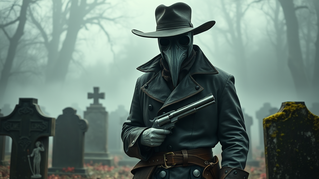 A 17th-century plague doctor stands solemnly in a fog-shrouded graveyard, donning a wide-brimmed hat and a foreboding beak mask. His leather attire, weathered yet resilient, contrasts with the gleaming 6-shooter revolver holstered at his side. The scene unfolds with epic fantasy elements, rendered in striking 8k resolution, where cinematic lighting casts dramatic shadows. Each detail of the environment and the doctor’s attire is captured in sharp focus, achieving a photorealistic depiction. The mist swirls around ancient, moss-covered gravestones, and the atmosphere crackles with otherworldly tension. This hyper-realistic portrayal employs advanced digital techniques, immersing the viewer in the complex yet haunting medieval landscape. The composition subtly integrates mystical elements that suggest a world where history and fantasy intertwine seamlessly.