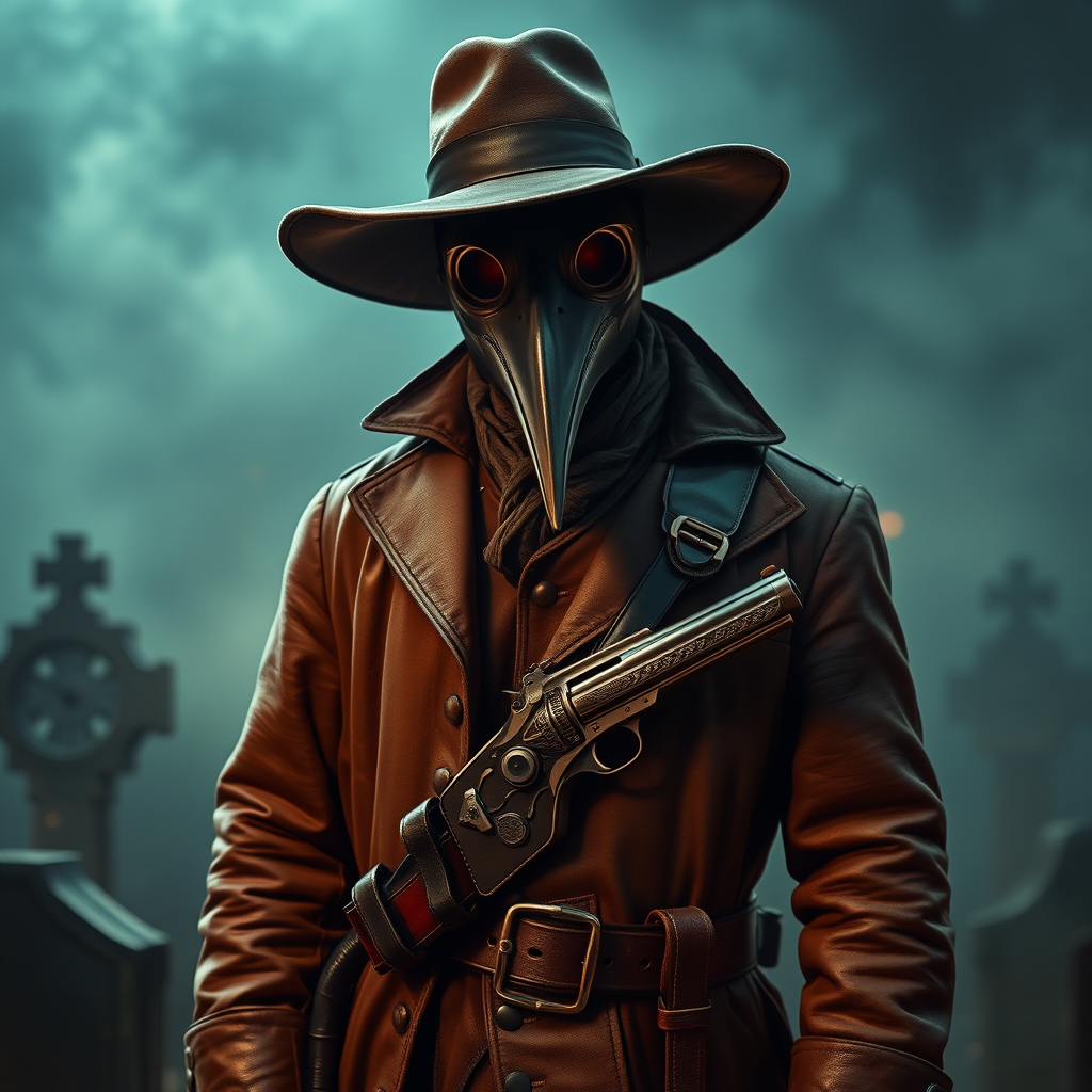 A 17th-century plague doctor stands solemnly in a fog-laden graveyard, shrouded in mystery and the eerie glow of cinematic lighting. Clad in a long, worn leather coat, a wide-brimmed hat casts shadows over his iconic bird-like mask, giving him an air of enigmatic authority. Strapped across his chest is a leather holster, home to an anachronistic 6-shooter revolver that gleams with polished menace. The mist swirls around the gravestones, adding depth to this epic fantasy scene captured in stunning 8k detail. The hyper-realistic rendering captures every intricate feature, from the texture of aged leather to the intricate designs etched on his cane. Sharp focus reveals the haunting eyes behind the mask's glass lenses, while the complex medieval setting is brought to life through advanced digital techniques, creating a photorealistic tableau that merges history with a touch of imaginative modernity.