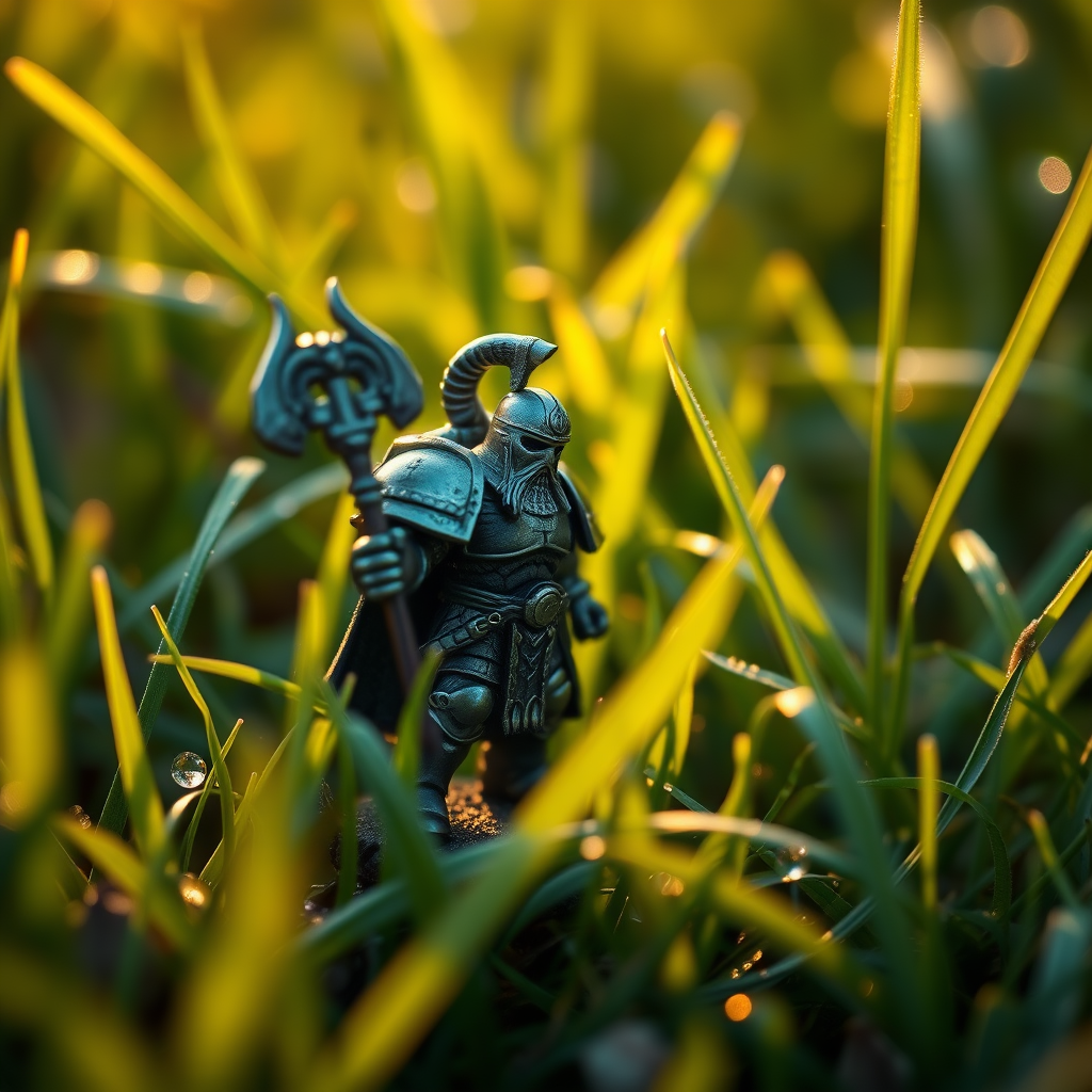 A 180 mm macro lens captures a miniature Warhammer 40000 warrior figure amidst lush grass, glistening with morning dew, bathed in gentle, golden light, showcasing warm and inviting colors with a 3:4 aspect ratio.