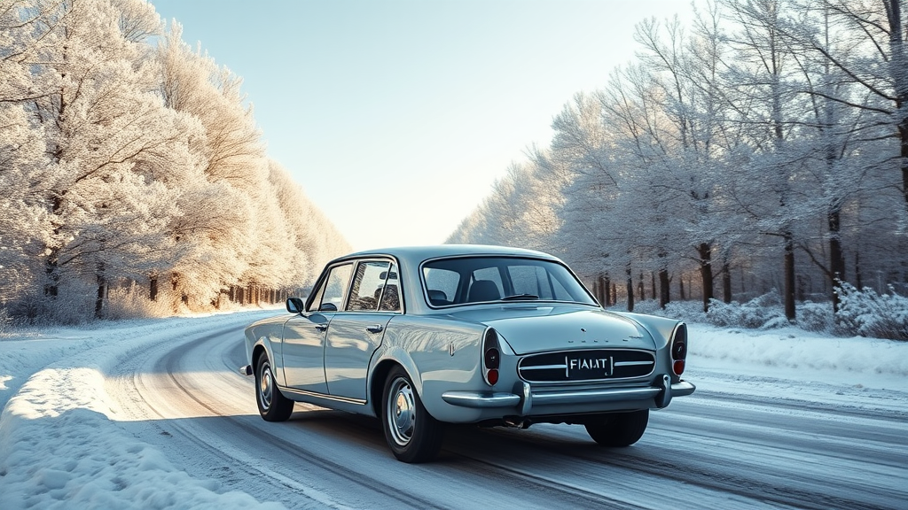 A 1960 silver Fiat Tipo 2018 sedan navigating a snow-covered road, with trees laden with frost lining the path, capturing the serene winter landscape in hyper-realistic detail, a blend of classic and contemporary design elements against the crisp, clear winter sky.