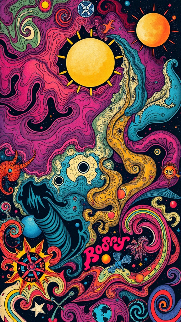 A 1970s inspired rock band album cover featuring psychedelic themes with swirling, vibrant colors and bold patterns, capturing the vintage essence of the era, interspersed with abstract imagery and intricate details, evoking a sense of dynamic energy and creative freedom.